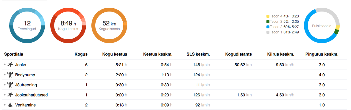 Laupäev: pikk jooks. Seekord võtsin plaani ca 2-tunnise jooksu, et nädala 50 km maht täis saada. Tegime koos natuke väiksema JJV pundiga, kuna osad ei saanud tulla. Vihma küll sadas ja tuul oli vahepeal natuke vastu ka, aga pundiga läks see 2 tundi nagu linnutiivul ja üldiselt hea ja kerge jooks sai kokku. 🙂 18,55 km, 6:32 min/km, 147 bpm.
