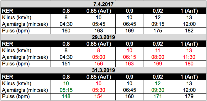 Kui RERi võrrelda 2017. aastaga, siis selgelt jäävad silma RERi madalamad väärtused kiirustel 8–10 km/h. Tundub, et need kiirused on minu jaoks kergemad, nendel kiirustel olen päriselt õiges suunas arenenud. 🙂 Panin ühe väikse tabeli ka võrdluseks juurde: