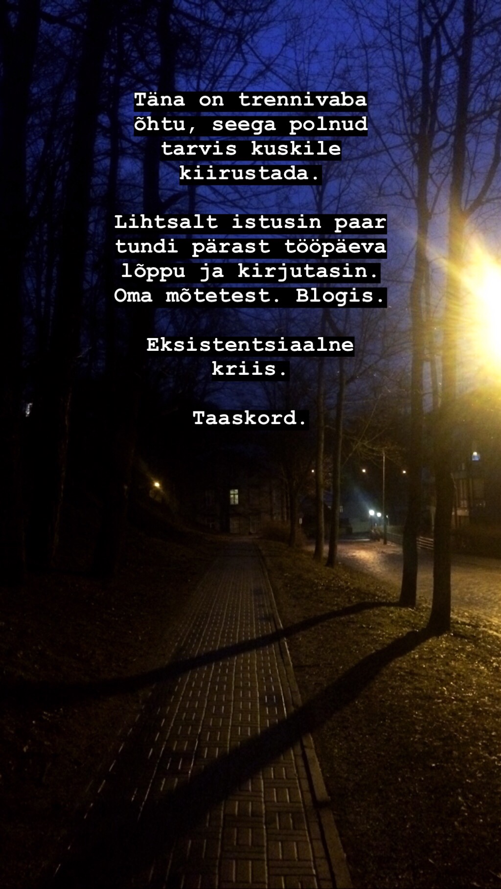 … aga ma totaalselt alahindasin seda tuult. Eedeni juures lisandusid tumedad sinised pilved ja ilusast päikeseloojangust polnud juttugi. Ihaste poole minek oli valdavalt allatuult, aga tagasitulek oli lihtsalt vastu seina pressimine. Lisaks oli tuntav temperatuur miinuses, lund (!) hakkas sadama ja mul jäätusid jalad ühe paari retuusidega konkreetselt ära. Liiguta siis neid jäätükke tempokalt ja särtsakalt. 🙄