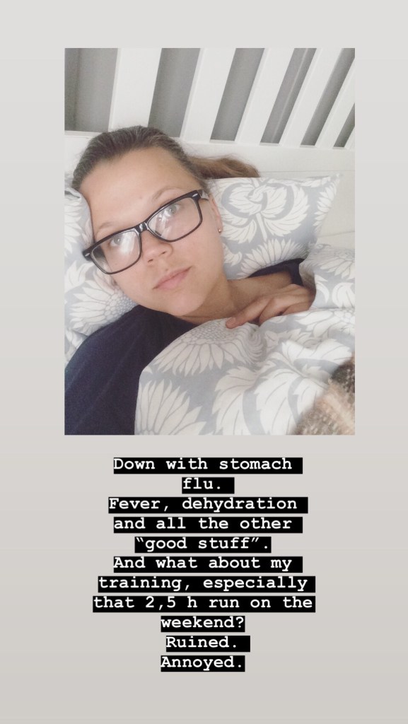 Laupäev: trennivaba. Oleks pidanud olema ca 10-kilomeetrine treening koos rütmijooksudega, aga ma tundsin end ikka nii nõrgalt, et olin terve päeva voodis siruli. ☹️ Kõht oli ikka nii tundlik, kohati valutas, lisaks iiveldus. Kraadiklaas näitas vahepeal ikka kraade kuni 37.5. Sellise enesetundega ma jooksma minna küll ei julgenud/tohtinud. Puhkasin ja palvetasin, et tunneksin end paremini ja saaksin vähemalt pühapäeval midagigi ära joosta.