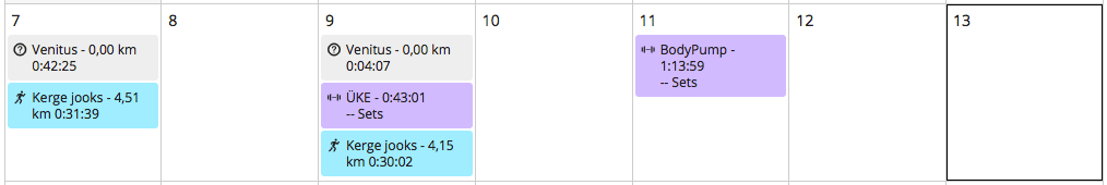Reede: BodyPump. Mu reied ja rinnalihas olid ÜKEst korralikult kolmapäevast valusad. 11-nädalane Pumpi-paus muidugi ei aidanud ka asjale kaasa. 😅 Olin BPs täitsa nagu algaja. Tegin kõik lood enam-vähem soojendusraskusega ning päris raske oli. Kavast veel eriti midagi aru ei saanud, eks järgmine kord annab arutust.