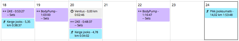 Reede: BodyPump. Taaskord miksitud kava päev. Osa lugusid kordus teisipäevasest trennist, osa olid välja vahetatud. Pumpi kavad vahemikus 80–100 olid ikka nii ägedad. Lisaks tegime me nii biitsepsi kui ka triitsepsi loo topelt, seega mina oma nõrkade käsivartega surin täiega. 😅 Aga see on hea ja mõnus surm.