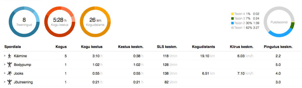Tundub, et kolm kõnd-jooksu eelmisel nädalal selliste palavate ilmadega oli siiski liig. Praegu kahjuks ei saa ma muud teha, kui vargsi neid asju katsetada ja siis omi järeldusi teha. Sel nädalal kärpisin kõnd-jooksude hulka võrra ja tegin muid madalapulsilisi treeninguid, kus pulss ühtlasem püsib. Kõnd-jooks on mu südamele justkui lõigutrenn hetkel, tuleb välja.