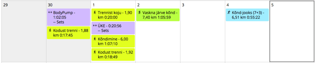 Pühapäev: trennivaba. Enesetunne oli üldiselt kehv ja pea oli terve päev uimane, seega tegin täieliku puhkepäeva.