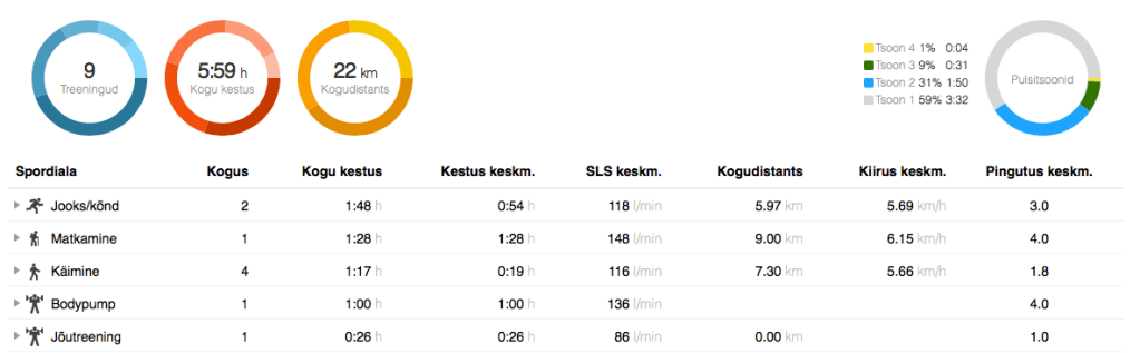 Kolmapäev: Jooks Jõud Venitus. Kuna BodyPump on ikkagi minu jaoks praegu suhteliselt pikk ja kõrge pulsiga treening, olen otsustanud kolmapäeviti JJVs mitte kõnd-jooksu proovida, et ei peaks jälle nädala lõpus mingite valudega võitlema. Vähemalt esialgu. 6 km, 10:32 min/km, 101 l/min. Koos trenni ja koju kõndimisega kena 10 km kõndi ja väike ÜKE osa peale. Mahukas.