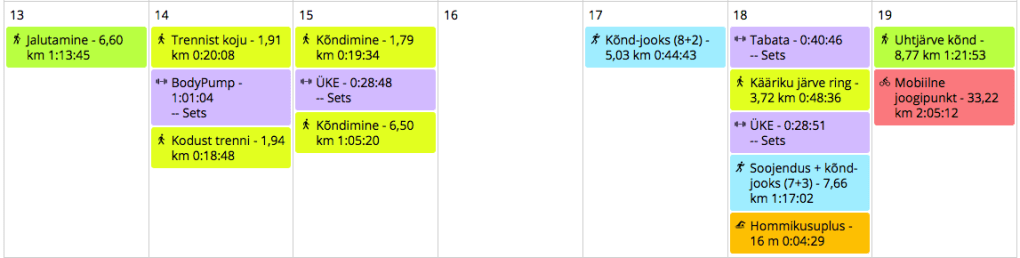 Reede: jooks-kõnd. Õhtul algas JJV Kääriku laager. Esimese trennina sain kirja 5 km kõnd-jooksu 8+2 minutit süsteemis. Sörkida julgesin ainult mäest alla, õnneks need kaheminutilised intervallid täpselt klappisid allamäge lõikudega. Pigem tegin lühemad jooksuintervallid, sest nii palju laagritegevusi oli veel ees. Kuidagi piinlik on neid kõnd-jookse Garminis jooksudena kirja panna, aga kuna seal natuke jooksu on ja see on hetkel minu ainus “jooksu”trenn, siis äkki on mõistlik neid eraldi värviga eristada, et endal silma peal hoida? Ma ka ei tea. 5 km, 8:54 min/km, 133 l/min