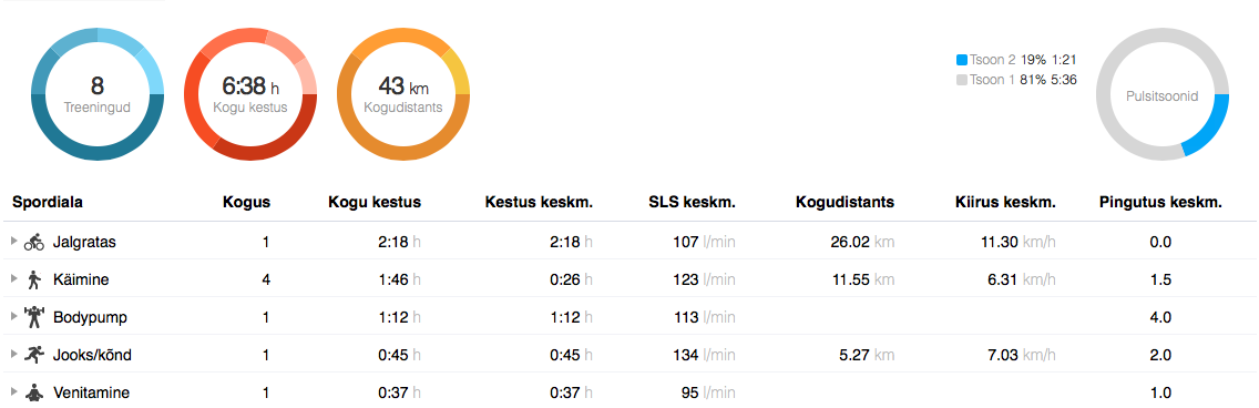 Kas asi on arenenud treenituses või milleski muus, aga sel korral suutsin Pumpis südant ja pulssi juba igati hästi kontrolli alla hoida. Keskmisele pulsile viskasin juba enne venituse blokki pilgu peale ja number seal näitas 115: tükk maad madalam kui eelmisel nädalal ja igati sobilik minu seisundile. 🙂 Niimoodi saab trenni juba isegi päriselt nautima hakata. 71 min, 113 l/min
