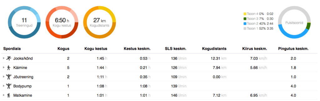 Esmaspäev: Jooks Jõud Venitus. Sain endale Aveliisi seltsi ja nüüd on kõnd-jooksud sada korda meeldivamad, sest seltsis on ikka segasem. Tegime ühe mõnusa Anne kanali ringi 5+5 süsteemis (5,5 km, 8:36 min/km, 143 l/min) ja seejärel mõnusalt tõhusa kerelihaste ÜKE otsa (32 min, 106 l/min). Kuna tegin maratoniks valmistuva härra Jooksjaga teiperit moraalse toena kaasa, siis olin süsivesikutest tühi ja see andis aeroobses osas endast korralikult tunda. Üldiselt siiski väga hea trenn. 🙂