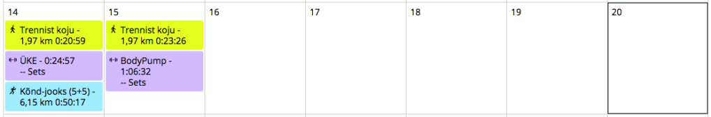 Teisipäev: BodyPump. Pumpis oli jõudu küll ja veel. Üle saja aasta sai kükid ära tehtud 5+5 kg kangiga. Õlaloos tuli juba isegi rohkem kui 16 kätekõverdust hambad ristis sirgetel jalgadel ära. Enesetunne oli tugev ja meeleolu hea. Lausa nii hea, et regasin end reedesse Pumpi ka ära. 66 min, 142 l/min