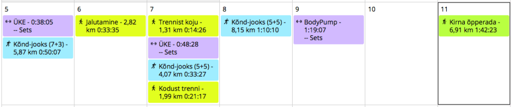 Reede: BodyPump. See oli üks tõhus Pump. Uus kava siiski pole lemmik ega ilmselt ka saa selleks, aga reedel oli jälle kuidagi nii mõnus vibe trennis ja kaks lisalugu seljale ja jalgadele andsid lihastele eriti mõnusalt tuld. Tundsin end trennis hästi ja tugevalt. 79 min, 137 l/min