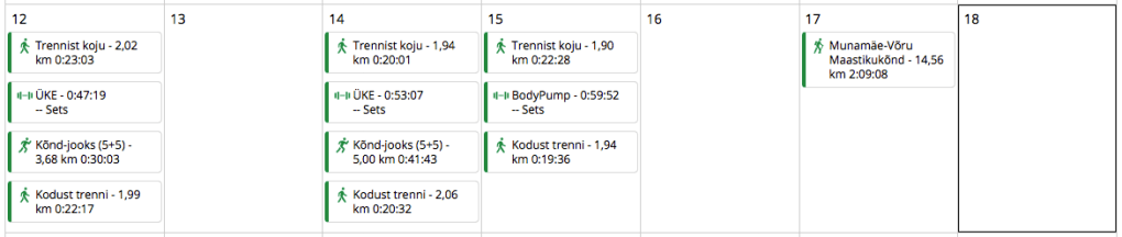 Nüüdsest on selle aasta võistlused täielikult lõppenud, mis annab lootust, et ehk on natuke lihtsam mingisse kindlasse treeningrutiini sisse elama hakata, ilma et peaks iga nädal pikemalt nuputama, mida ja millal teha tohiks, et mitte üle pingutada. 🙂 Loodetavasti saan sisse töötada süsteemi, kus teisipäev ja laupäev on puhkepäevad (vajadusel ka neljapäev), pühapäeval teen pikema kõnni-jooksu matka (1+ tundi) ja nädala sisse jääb kaks JJVd, üks Pump ja soovi korral veel üks aeroobne trenn. Eks näis, mis saab.
