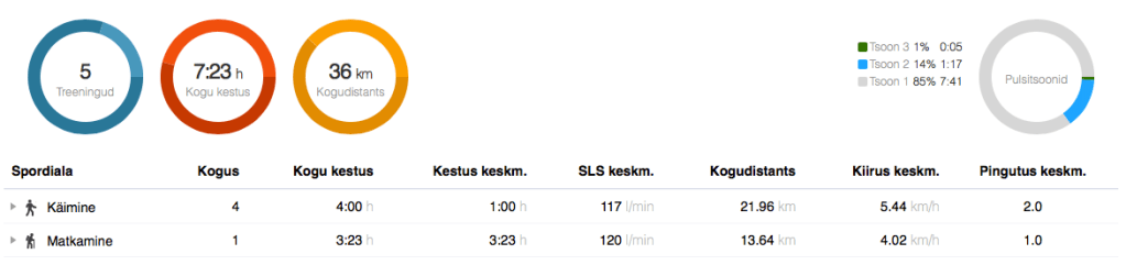 Sellised päris pikad kõnnimatkad on mulle (üllatuslikult) praegu äärmiselt jõukohased, sest keskmine pulss püsib kenasti madalamal kui arsti lubatud tsoonis (135–141). Enesetunne on alati väga hea ja järgmisel päeval ei tundnud mingit väsimust kehas sees, ainult lihased olid libedusel stabiliseerimisest päris valusad. Tunduvalt lühema kestusega jooks-kõnd ajab kahjuks isegi siledal maal keskmise pulsi natuke liiga üles, kui ma kogu aeg silmad punnis kella ei vahi. Seega olen pannud nüüd rohkem rõhku kõndimisele ja üritanud seda nautida. 🙂