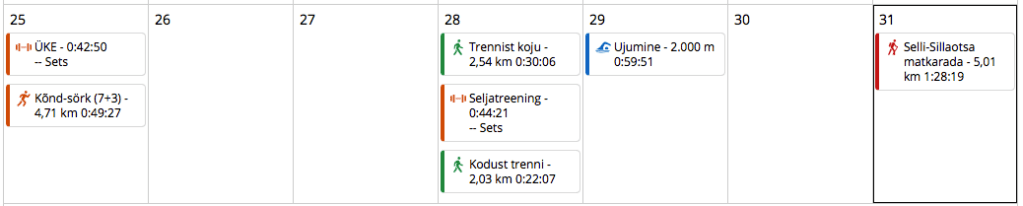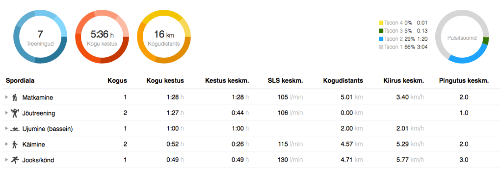 Esmaspäev: Jooks Jõud Venitus. Tegin hästi rahulikult kõnd-sörki 7+3 süsteemis (4,7 km, 10:30 min/km, 130 l/min) ja seejärel mõnus korralik ÜKE peale, fookusega kõhul ja seljal ehk kerelihastel (43 min, 108 l/min).