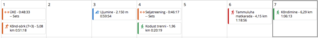 Esmaspäev: Jooks Jõud Venitus. Veidi pelgasin eelmise nädala alguse südamevalude taustal, kuid siiski proovisin hästi rahulikult kõnd-sörki (7+3 süsteemis). Tõesti võtsin sörgi osa absoluutselt nii rahulikult, kui vähegi oskasin. Üldiselt polnud väga viga, aga siiski tundsin selgelt, et südamest on mingi asi üle käinud, sest tunne oli eelmisest kordades omajagu erinev. Õnneks seekord pärast trenni sümptomid välja ei löönud. 5,1 km, 10:06 min/km, 136 l/min ÜKEs ma isegi ei mäleta, mis harjutusi me täpselt tegime. Olime suurel matil ja planke oli omajagu. Igal juhul veel kolmapäeval basseinis tundsin ma väga selgelt oma kerelihaseid. Magus, magus valu! 🙂 48 min, 116 l/min