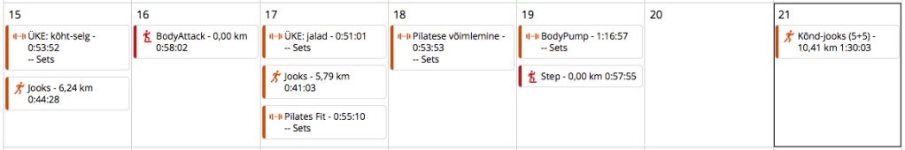 Ma tean isegi väga hästi, et selle nädala trennikoormus oli hullumeelne ja mul pole mingit kavatsust sedaviisi jätkata. Sai end proovile panna, sai katsetada ja ma pidasin vastu. Endale jälle midagi tõestatud. 🙂 Vähemalt on mul nüüd kõigi nende katsetuste järel päris hea aimdus, kuidas oma sügis-talvine trenninädala rutiin kokku panna, et oleks piisavalt vaheldust, piisavalt koormust ja piisavalt puhkust. Lähen tagasi vana ea 3+1, 2+1 süsteemi peale, kus esmaspäevast kolmapäevani on trenn, neljapäev trennivaba, reede ja laupäev trenn, pühapäev trennivaba. Saab joosta, saab matkata, saab lihastele tuld anda. Vaatame, kuidas kulgema hakkab.