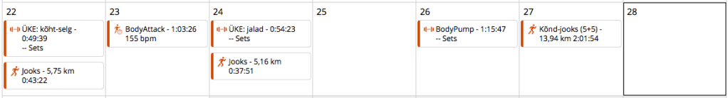 Reede: BodyPump. Lõpuks hakkasid jalad taastumise märke näitama, kuid väljaastete lugu oli siiski ikka veel puhas kannatamine, sest olenemata kuidas ma ka ei oleks püüdnud, ikka tahtsid mõlema jala sääred korraga krampi tõmbuda. Tuli vahepeal viilida ja tavalisi kükke vahele teha. 🤷🏻♀️ Muus osas oli kava vanadest headest lugudeks kokku miksitud, lisaks tegime peaaegu iga loo vahele kätekaid. Sain ideaalselt aru, miks ma varem jõudsin palju rohkem sirgetel kätekõverdusi teha ja enam ei jõua: varem olid need peaaegu eranditult pingile toetudes ja kiired, nüüd on seeriad pikemad, tempod aeglasemad ja tihti tuleb kätekaid teha maas. Eks ma ise olen ka jätkuvalt nõrgem ja raskem, aga ilmselt on ka lood ajaga raskemaks muutunud. 76 min, 132 l/min
