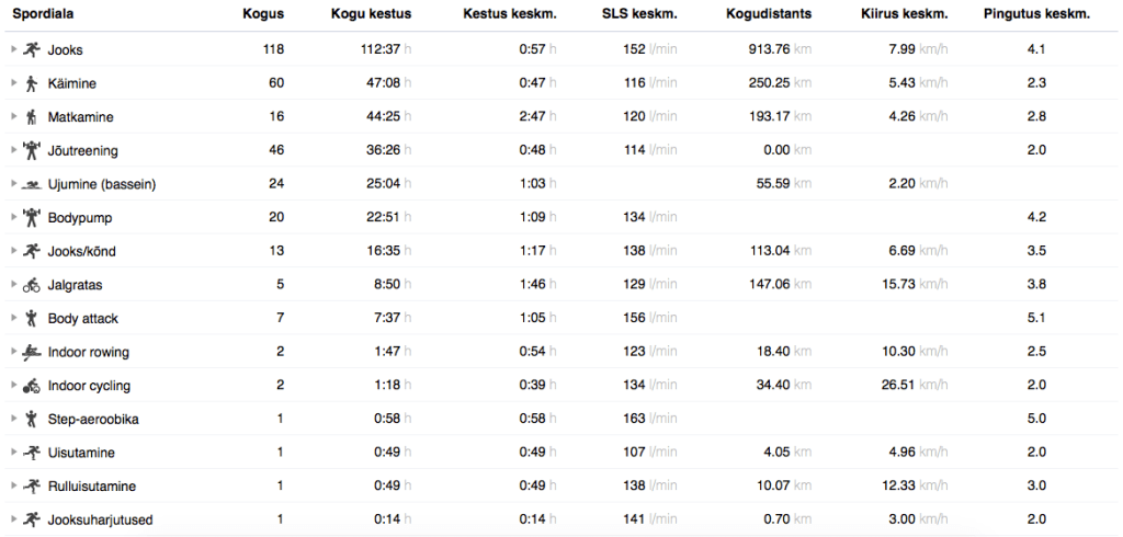 | Logitud trennitunde (h:min) | 327:27 | 290:48 | 271:55 | 332:37 | 334:21 | 345:07 | 426:00 | 537:00 |