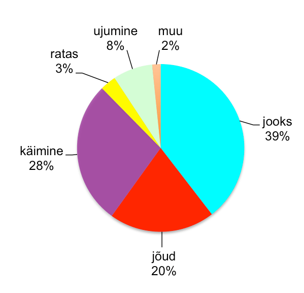 | Kõndimine ja matkamine | 28% | 51% | 3% | 2% | 3% | 1% | 11% | 13% |