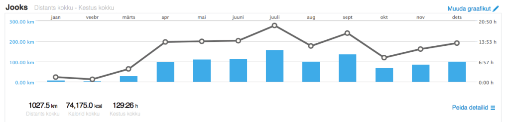 Aasta lõpus avastasin ma, et 1000 jooksukilomeetri kokkusaamine on käe ulatuses, seega võtsin ma end kokku ja tegin need kilomeetrid ära. Jooksin sel aastal distantsi poolest täpselt kolm korda rohkem kui eelmisel aastal. Tippaastatel jooksin kestuse poolest 180–210 tundi: sinna on veel kõvasti minna. Kuid arvestades, et alustasin jooksmisega tasapisi alles märtsi lõpus ja olin kaks korda aasta jooksul haige, sai siiski päris palju jooksutunde ja -kilomeetreid kogutud. Olen väga rahul!