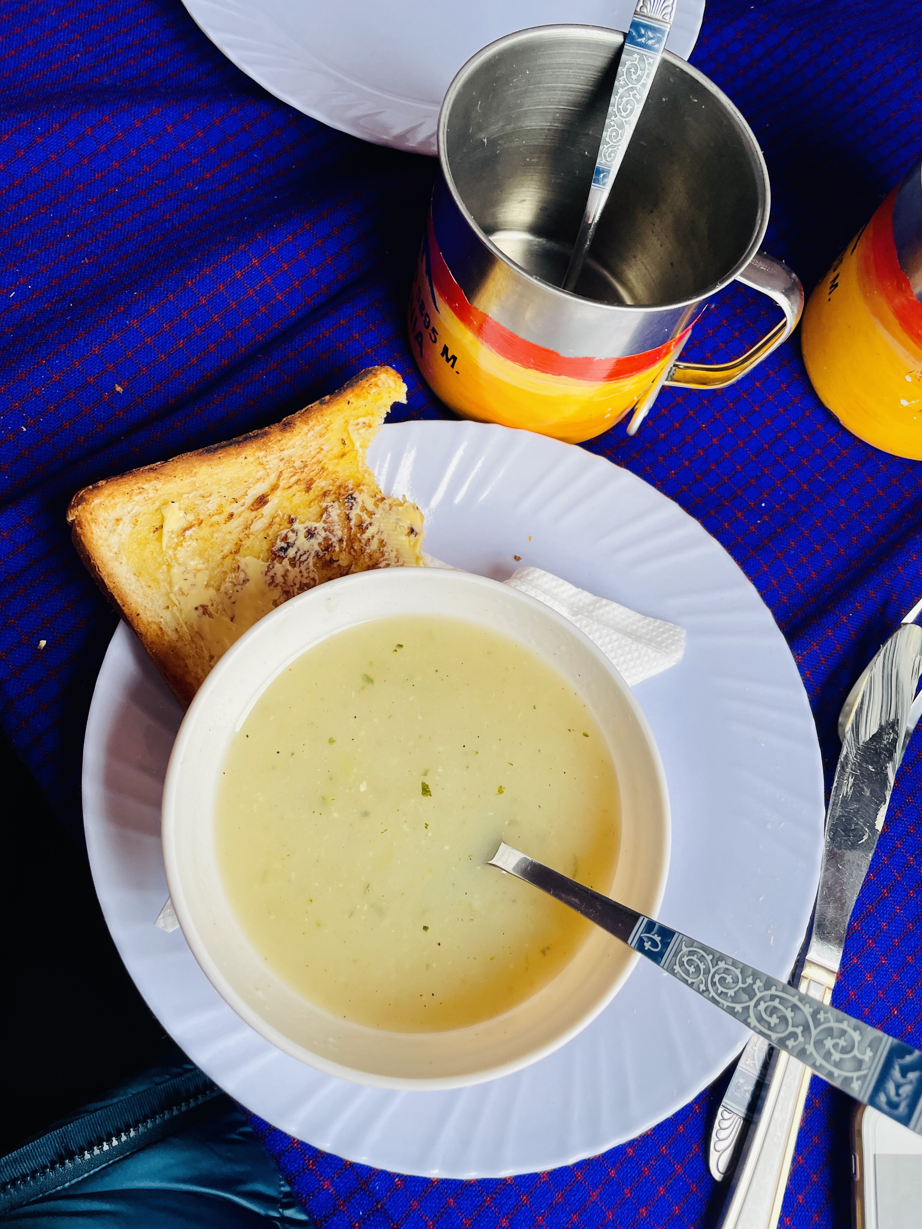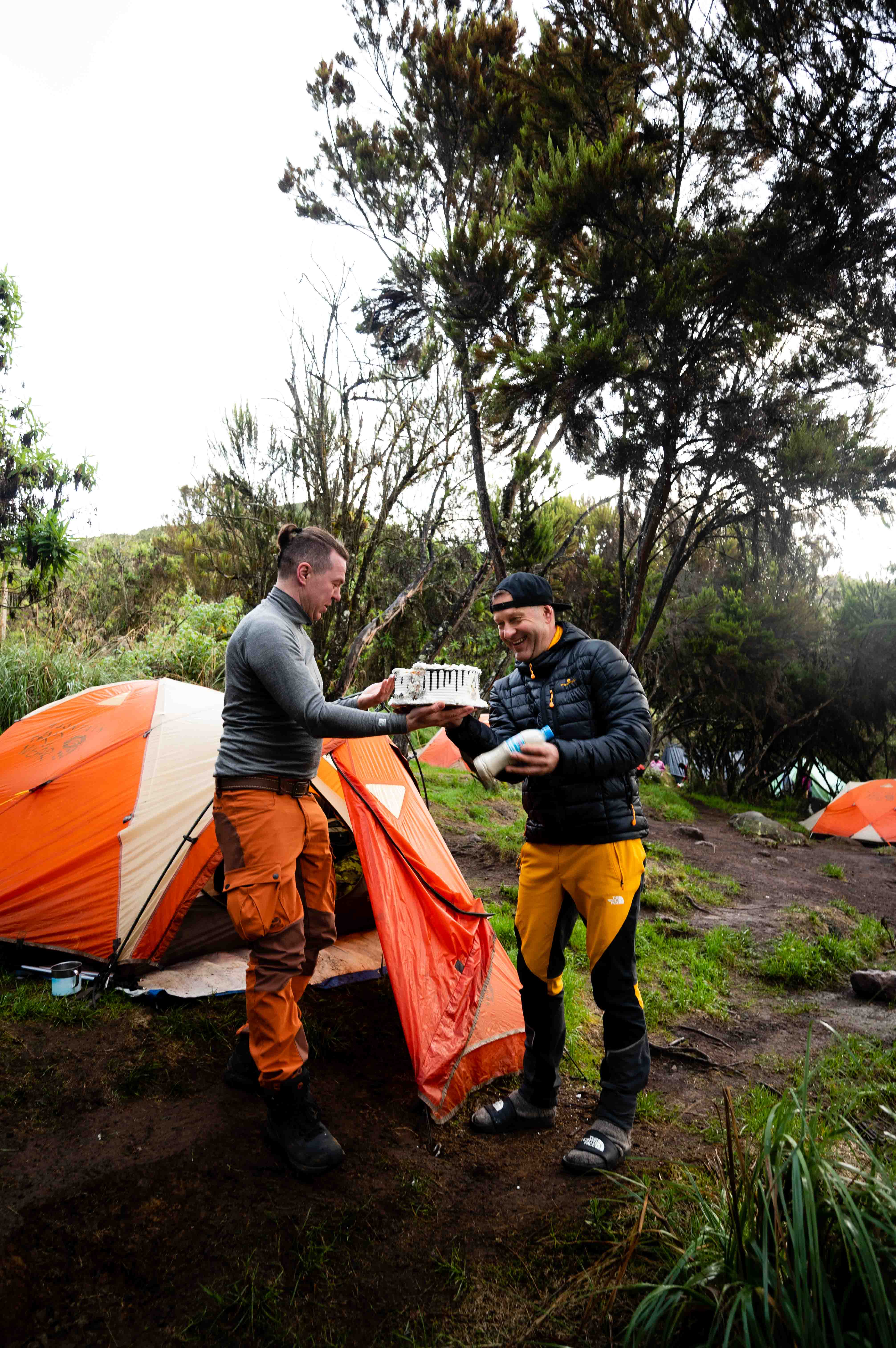 Teisel päeval oli äratus kell 6.30. Uni polnud suurem asi, vähkresin pidevalt ja olin kuskil poolunes kahe maailma vahel. Kiire näo- ja hambapesu, Ahto sünnipäevalauluga äratamine ja hommikusöök, kuhu kuulus tort, mille üks kandja Ahto jaoks üles oli tassinud. Täisteenindus. Korraks näitas Kili tipp end pilvede vahelt. Ikka kuradi kõrge! 😬 Pakkisime kotid uuesti kokku, täitsime veepudelid/veekotid, desinfitseerisime vee vastavate klooritilkadega ja kella 8 paiku hakkasime liikuma.