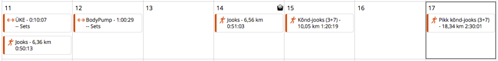 Pühapäev: pikk kõnd-jooks (3+7). Käisime härra Jooksjaga Pühajärvel sporti tegemas. Minnes oli nii unine ja uimane olla, polnud üldse mingit tunnet, et peaks nüüd jooksma hakkama. Õnneks iga kilomeetriga läks olemine paremaks. Lõpuks tegin kokku kaks ja pool tundi kõnd-jooksu 7+3 süsteemis, mida vastavalt vajadusele kohendasin, et enamik suuremaid tõuse saaks kõndides läbitud ja laskumised võtsin jooksujalu. Kokkuvõttes oli enesetunne ja pulss selle kohta, et ma siiski Otepää tõuse võtma pidin, täitsa ootamatult hea. Ma päris täpselt veel ette ei kujuta, kes 3 nädala pärast peaks suutma 24 kilomeetrit Otepäält Elvasse joosta, aga tegeleme selle probleemiga siis, kui see kätte jõuab. 18,3 km, 8:11 min/km, 147 l/min