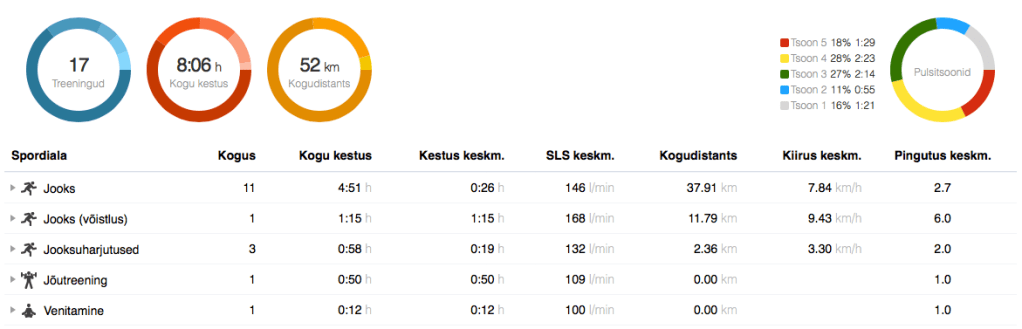 Neljapäev: hommikujooks. Neljapäeval tegin oma planeeritud jooksu ära hommikujooksu trenni raames. Nii sai enne võistlust kehale päris pika puhkeaja anda. Jooksujalu spordiklubisse, sealt Tähtvere spordiparki (4 km, 7:16 min/km, 142 l/min), taaskord kerge võimlemine ja harjutused peale ning jooksuga koju tagasi (2,8 km, 7:29 min/km, 142 l/min). Väga mõnus!