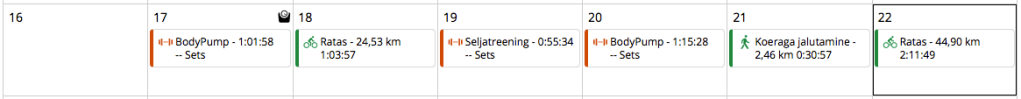Reede: BodyPump. Jälle päris mõnusa enesetundega Pump. Vanad head lood ja sain mõnusalt raskust kangile peale panna. 75 min, 128 l/min