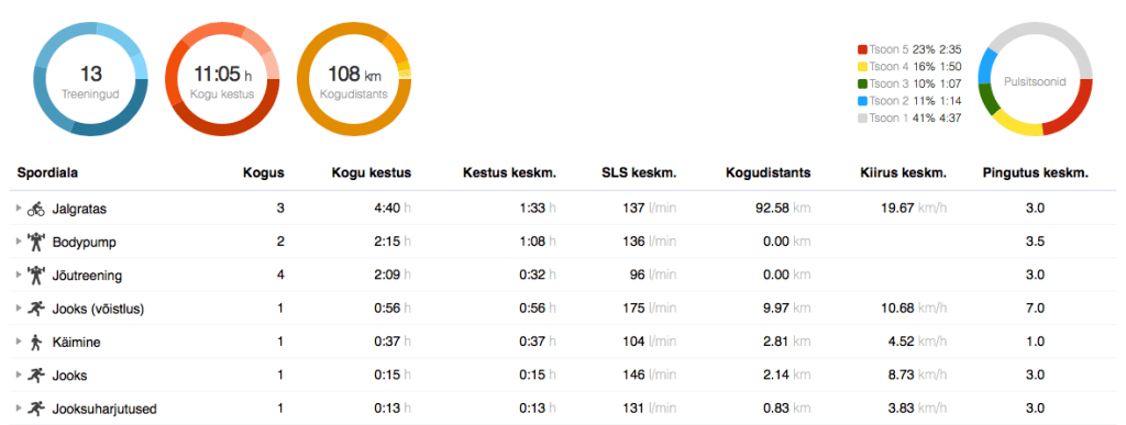 Reede: BodyPump. Kuna mul oli plaanis Ööjooks kuidagi läbitud saada, mitte aega joosta, siis ei hoidnud end reedeses Pumpis tagasi. Panin ilusti kangile raskuseid peale, seljaloos ja õlaloos tõstsin sellist kangi, millega ammu neid lugusid teinud pole. Hea ja tugev tunne oli, jaksasin ja jõudsin kõike kuidagi väga hästi enda kohta. Hea positiivse laenguga trenn. (74 min, 127 l/min)