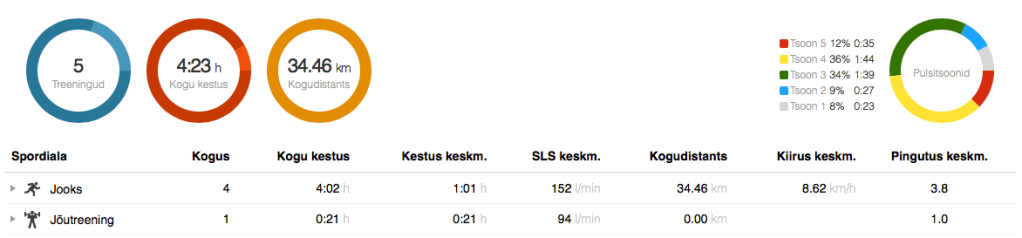 Kolmapäev: fartlek. Olin taaskord lähetuses, seekord Tallinnas. Tegin trenni pärast tööpäeva lõppu. Ööbisin südalinna serval ja oma lühikese jooksuga sealt valgusfooride hulgast läbisaamine on üpris keerukas. Lisaks tõmbasin jooksu alguses oma vöökoti luku otsa puru, seega ei saanud ma oma Nike Running Clubi äppi kuidagi pausile pandud, kui foori taha kinni jäin. Seetõttu olid kaks pikemat lõiku veidi ebamäärase pikkusega ja osad lühikesed kõikuva kiirusega, aga ehk ikka miskit kasulikku tehtud sai. NRC: Stronger Faster. Plaanis oli 3 plokki 3-minutilisi ja 30-sekundilisi lõike. Lõikude tempod: