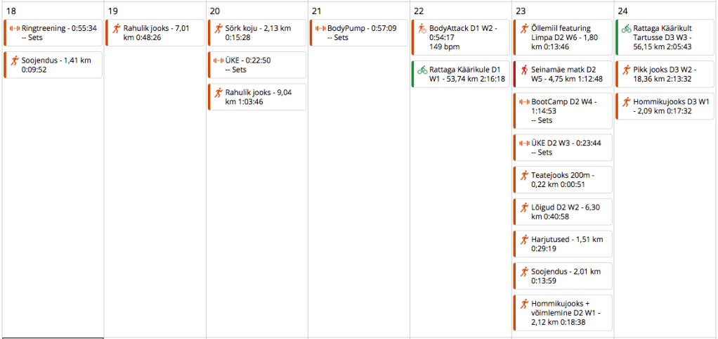 Eelmise nädala kokkuvõtmine vajas veidi rohkem aega, kuna trenni sai tehtud lihtsalt nii palju. Mitte ühtegi trennivaba päeva, kuid keha sai sellega suurepäraselt hakkama, sest töökohustusi ja -pingeid ei olnud. Sain keskenduda endale ja lihtsalt elada mõnusat elu täis trenni ja liikumist. Puhkus on ikka imeline aeg!