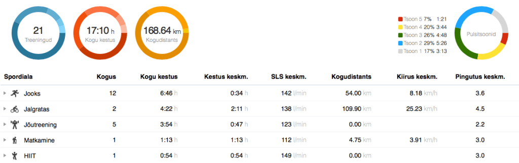 Kolmapäev: Jooks Jõud Venitus. Jõudsin lõpuks pärast nädalaid vigastust ja töölähetusi tagasi JJVsse. Oli ka aeg! Eesootava laagri valguses tegime vaid pikema rahuliku jooksu (9 km, 7:03 min/km, 150 l/min) ja veidike harjutusi kerelihastele (23 min, 113 l/min). Enesetunne polnud kõige kergem, kuid siiski aktsepteeritav. Koos jooksuga trenni ja tagasi sai kokku väga ilus number jooksukilomeetreid.