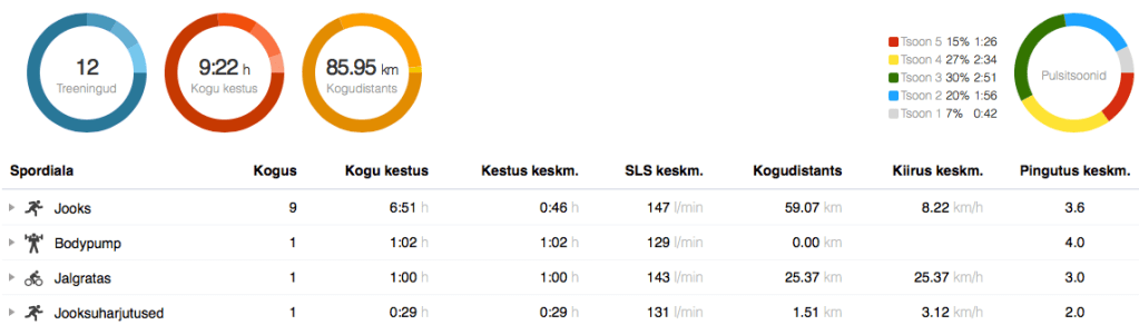 Sellest kõigest aga mulle ei piisanud. Tundsin end lõikudel täiesti jõuetuna ja kõht oli jälle krampis. Tegin need lõigud ära nagu ellujäämiskursuse. Mingit tempot isegi ei proovinud hoida, oli piisavalt tegemist lihtsalt kuidagi läbimisega. Karm, karm, karm. Kui eelmisel nädalal läksid need 400-meetrised lõigud nii kenasti, siis see nädal oli täiesti vastupidi. Lõikude tempod: 5:19, 5:36, 5:42 min/km. Pulss oli 165–170 ringis, kuigi enesetunne vastas vähemalt 185-löögisele pulsile.
