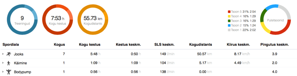 Järgmisel nädalal ootab ees kolm rahulikku jooksu, üks ühistrenn, üks pooles vinnas BodyPump, üks võistluseelne soojendus ja Jüri Jaansoni Kahe Silla Jooks. Ootan juba huviga jahedamaid temperatuure, nüüdseks on piisavalt jooksuradadel end kuumutatud. Vaatame, mis vorm normaalsemates ilmatingimustes tegema hakkab.
