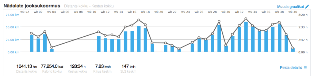 Siin on näha käesoleva aasta nädalate jooksumaht: siniste tulpadena kilomeetrid, halli joonena aeg. 40 nädalat, 1041 kilomeetrit ja 128 ja pool tundi. Eelmisel aastal olin samaks ajaks läbinud 750 km ja rajal olnud 93 tundi. See on mõlema näitaja poolest ca 38% tõusu. Lisaks omajagu tunde rattasõitu ja jõutrenni, mida eelmisel aastal oli tunduvalt vähem. Teadsin, et olen sel aastal rohkem jooksnud, kuid et nii palju rohkem… See oli üllatus. Oma tippaegadeni mahu poolest veel ei küündi (ca 1500 km, 150–160 h), kuid tööd on tehtud kõvasti. Eriti kui silmas pidada, milline ebaõnne hädaorg käesolev aasta olnud on.