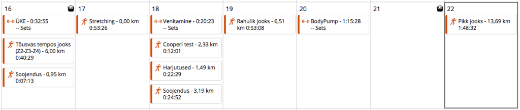 Kolmapäev: Jooks Jõud Venitus. Cooperi testi päev. Kuna järgmisel kolmapäeval olen ma Tallinnas, siis tuli minul Cooperi test enne ära teha. Teadsin seda ette ja valmistusin terve päev: pöörasin ekstra tähelepanu söögivalikutele ja -aegadele ning veejoomisele. Ometigi tundsin juba soojendusjooksu ajal, et lihtne olema ei saa (3,2 km, 7:49 min/km, 148 l/min). Pulss tõusis kõrgustesse, enesetunne oli meh. Eks omajagu oli ärevust ka, ma ju teadsin, et need 12 minutit kerged olema ei saa. Jooksuharjutused koos lahtijooksudega möödusid täpselt samuti.
