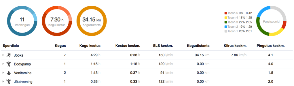 Reede: BodyPump. Kolmas trennipäev järjest ja suuremad ootused mul puudusid. Tegelikult oli energiat piisavalt ja enamikes lugudes võtsin rohkem raskust kangile kui varem selle kavaga. Isegi väljaastete loo tegin kangiga ja õlaloos kannatasin raskema kangiga selle seti ära. Ei tea, kust see särtsakus tuli. (75 min, 120 l/min)