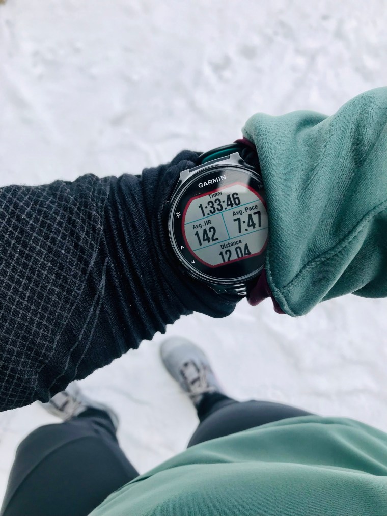 Pühapäev: pikk jooks. Sellel nädalal oli plaanis lühem pikk jooks, pikkusega 1:15–1:30. Võtsime Liisi, Kaire ja Mariaga ette väikese Ihaste ringi. Üle pika aja oli jälle korralik miinuskraad väljas, aga õnneks seekord riietusega puusse ei pannud. Pulss püsis kena, tempo oli rahulik ja üheskoos jutustades oli ikka toredam. (12,04 km, 7:48 min/km, 142 l/min)