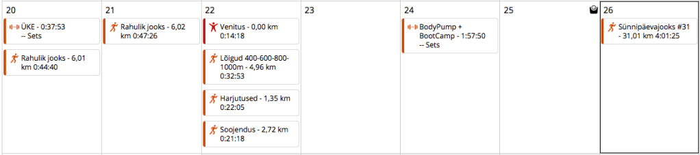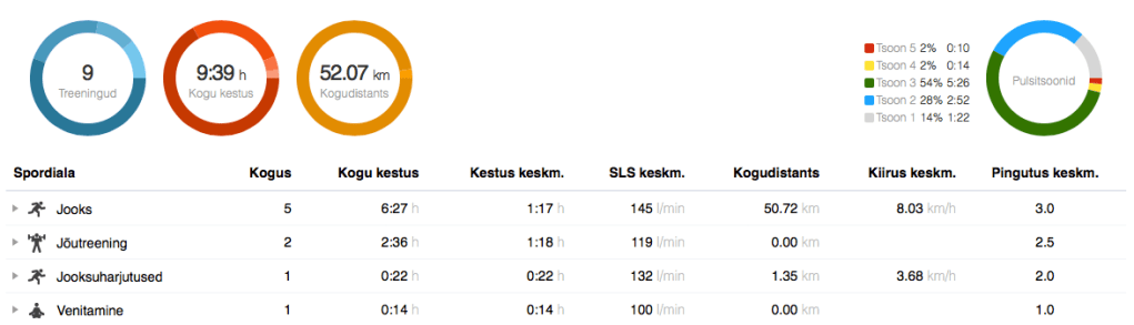 Kolmapäev: Jooks Jõud Venitus. Lõigutrenni päev. Kiire soojendus (2,72 km, 7:49 min/km, 132 l/min) ja terve posu jooksuharjutusi otsa. Lõikude osas oli ülesanne lihtne: päris punases ei küta, kõik lõigud soovituslikult sama tempoga ja ees ootas lõigu”trepp”: 400, 600, 800, 1000 meetrit. Jooksin koos Kairega ja täitsime ülesande sekundipealt. Esimesed kolm lõiku jooksime täpselt 5:00 min/km tempos ja 1000-meetrise 4:56 tempos. Pulss kiskus lõikude lõpuosas ikka punasesse, aga enesetunne oli seejuures väga hea. Võib 100-protsendiliselt rahule jääda. (4,96 km, 6:38 min/km, 160 l/min)
