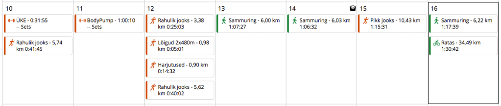Treener soovitas kaheks päevaks kalender trennidest tühjaks lükata ja nädalavahetuse pikem jooks teha lühike, maksimaalselt 75 minutit. Kui ma veel midagi õppinud olen, siis seda, et kui Treener näeb ohumärke ja midagi soovitab, siis tasub kuulata. Lükkasin reedese jooksu cancelisse ja tühistasin plaanid pühapäeval rattaga pikemalt trippida.