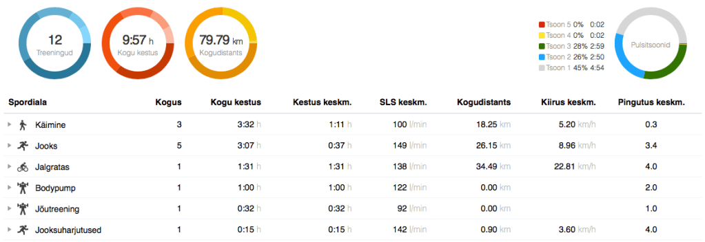 Esmaspäev: Jooks Jõud Venitus. Võistlus oli värskelt seljataga, seega midagi erilist ette võtta ei saanud. Tegime Kaire ja Kerliga rahuliku jooksu ja üllatavalt tundsin ma end täitsa hästi. Lihased ei andnud tunda, enesetunne oli okei, pulss oli kena. (5,74 km, 7:16 min/km, 141 l/min) Seejärel rullisime veidike, kuniks kõik olid oma jooksudega lõpetanud ja tegime otsa kiire ÜKE. Kõht ja selg. Mul olid järgmine päev sellest 15 minutist kõhule kõik lihased täiesti valusad. (32 min, 92 l/min)