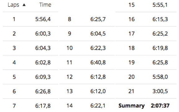 Pool maad läks keskmise tempoga 6:13 min/km. Olin enne võistlust eeldanud, et minu pulsiplaaniga võiks tempo olla 6:20 kandis. Ma ei teadnud päris täpselt, mis veel ees ootamas olla, arvasin, et tempo kindlasti väheneva energiareservi ja kuumeneva ilma foonil veel langeb. Eelduslikult võiks lõpuaeg olla 2:10 kandis, kui suudaksin samas tempos lõpuni minna.