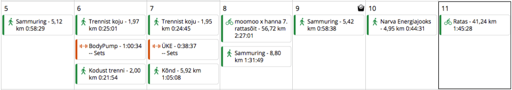 Neljapäev: moomoo x hanna 7. rattasõit. Taaskord üks väga mõnus veeremine koos Hanna naiste pundiga. Grupp sõidab aina sujuvamalt koos ja lausa lust on need neljapäevased sõidud. Parim otsus, et aprillis esimesele ühissõidule läksin. (56,7 km, 23,1 km/h, 123 l/min)