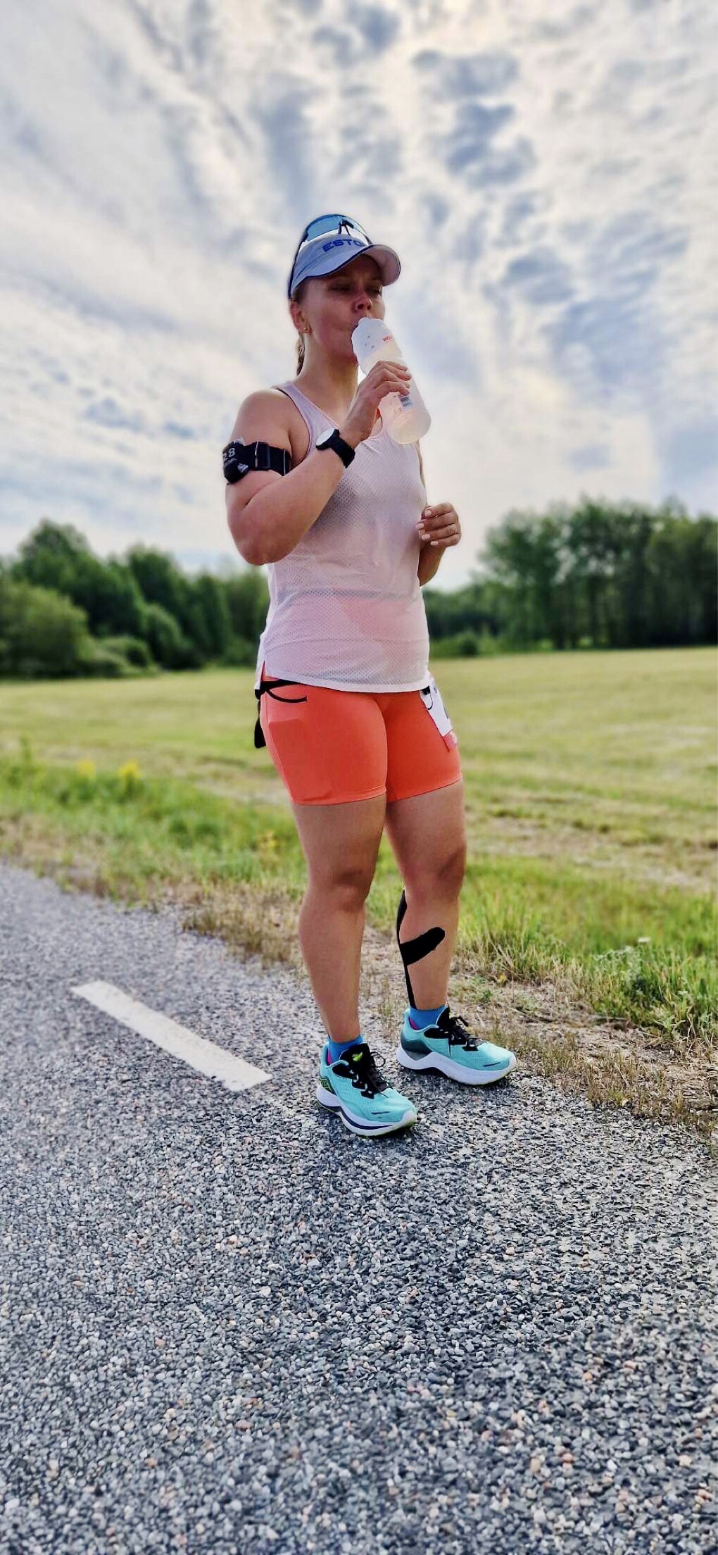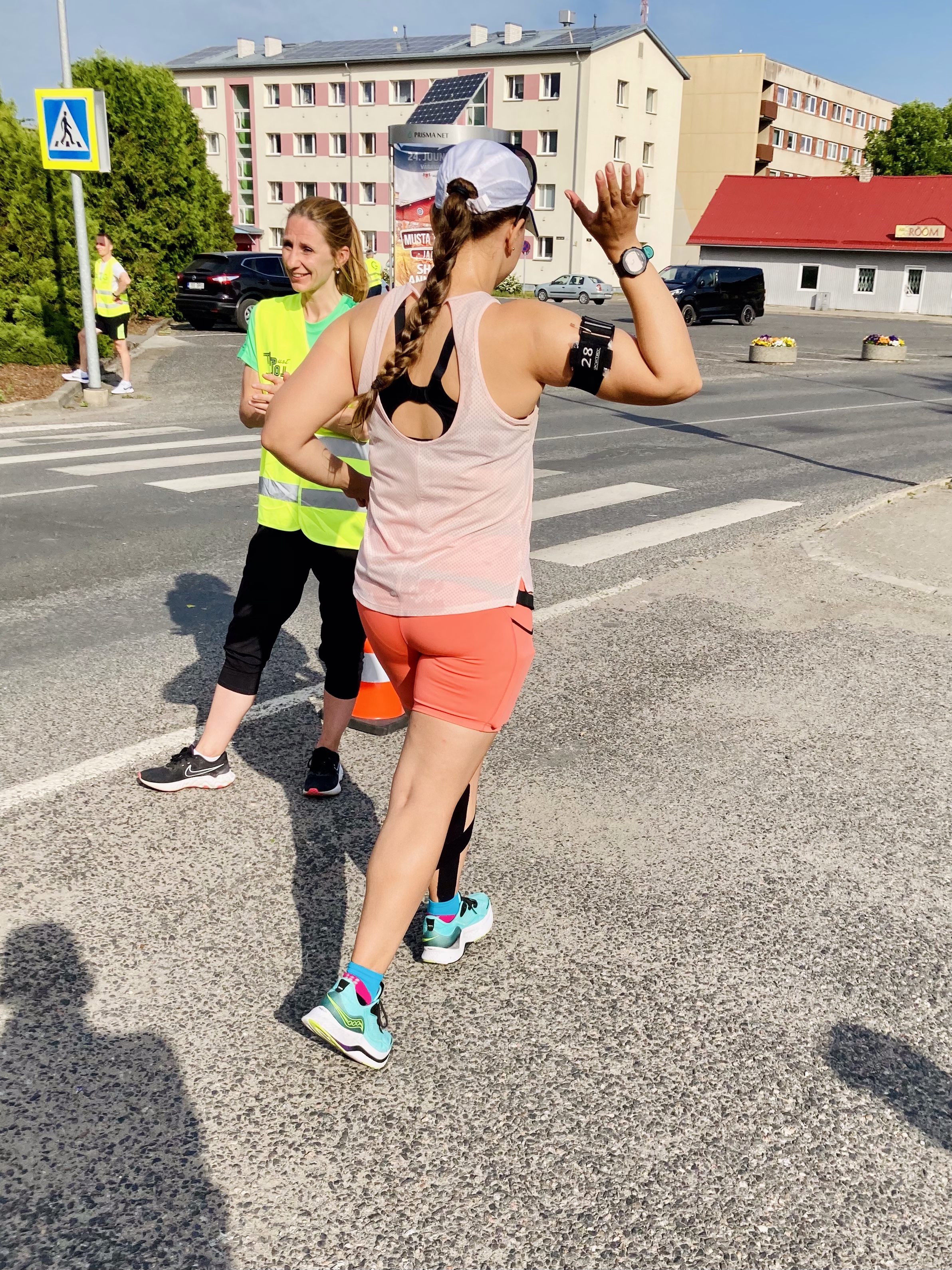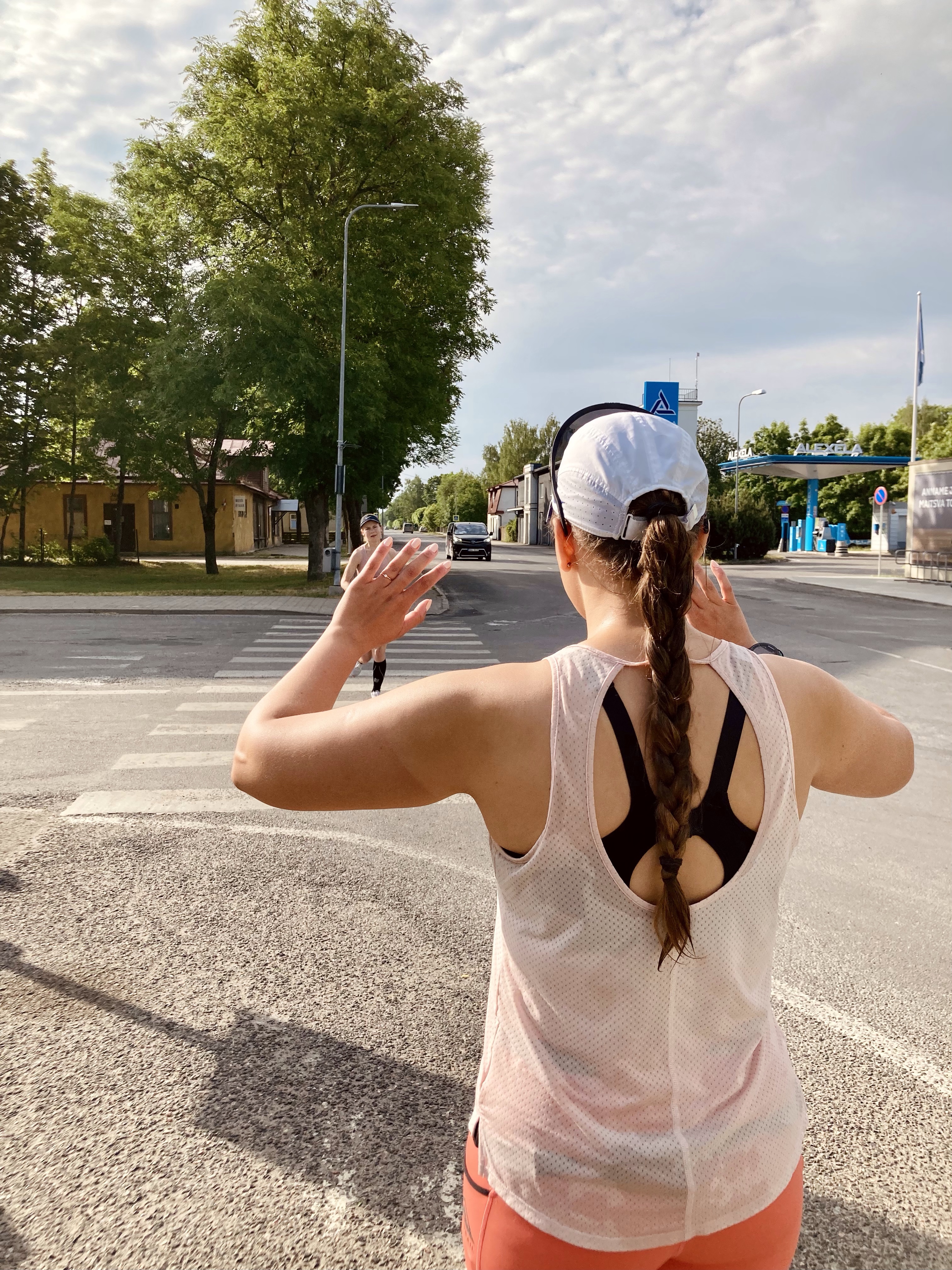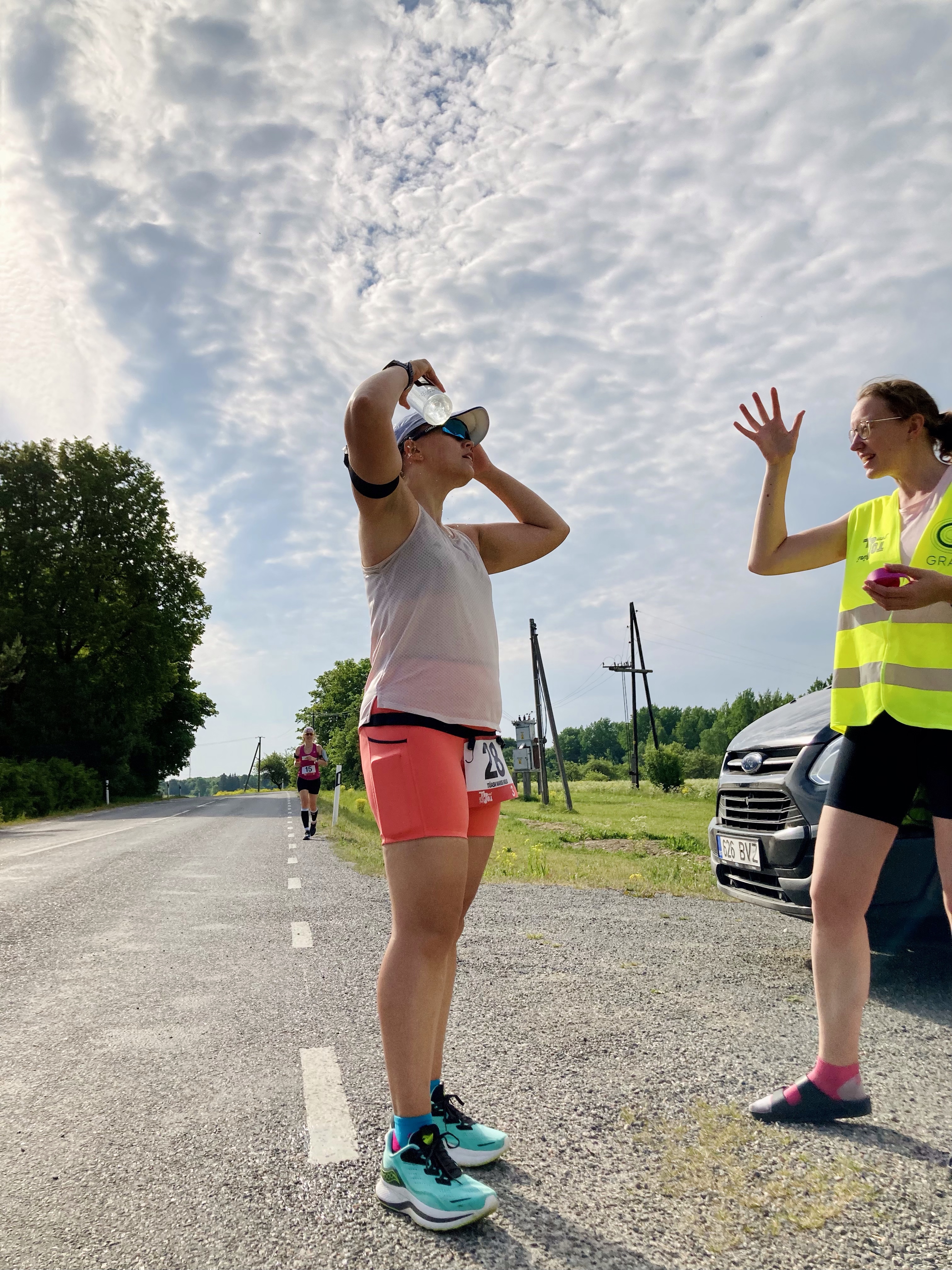Teise vahetuse alguses, kui kell oli 7.30, oli juba lühikeste riietega liiga palav tee ääres seista ja jooksjat joota. Lootsime, et uus päev ja Põhja-Eesti toovad jahedama temperatuuri, aga ei midagi. Päike lõõskas taevas. Kui aga Tapale lähenema hakkasime, ilmusid taevasse vaikselt pilved. Läksin oma viimasele vahetusele vastu kell 8.26. Enne kastsin end korralikult veega märjaks. Päikesekreem, -prillid ja nokats on iseenesest mõistetavad.
