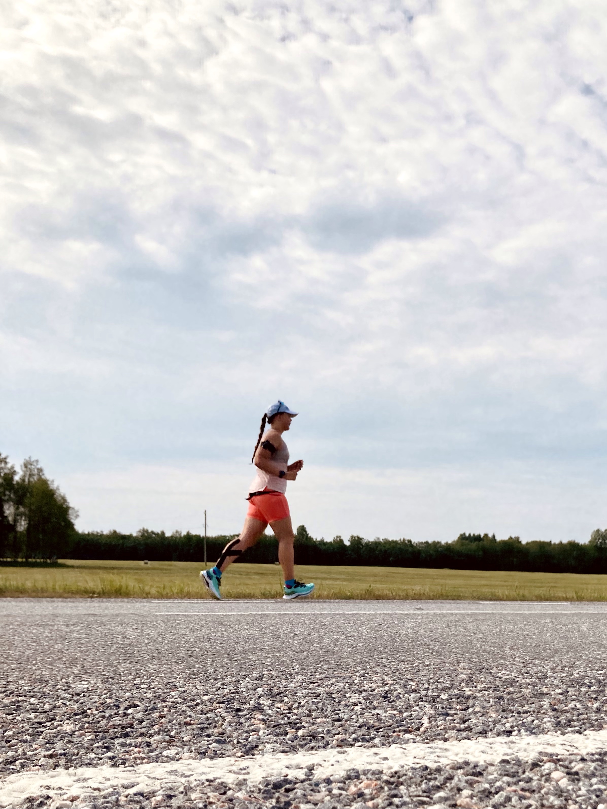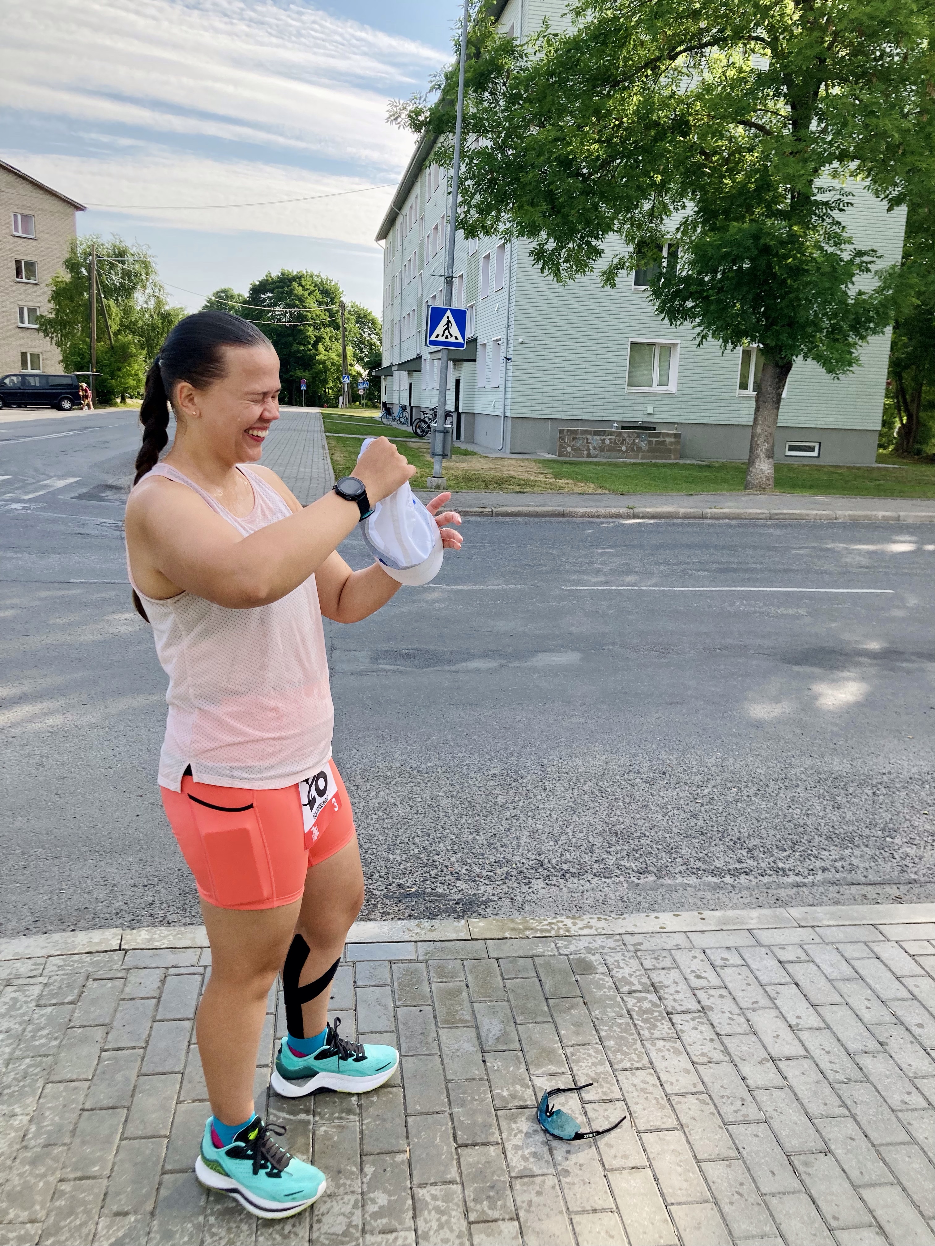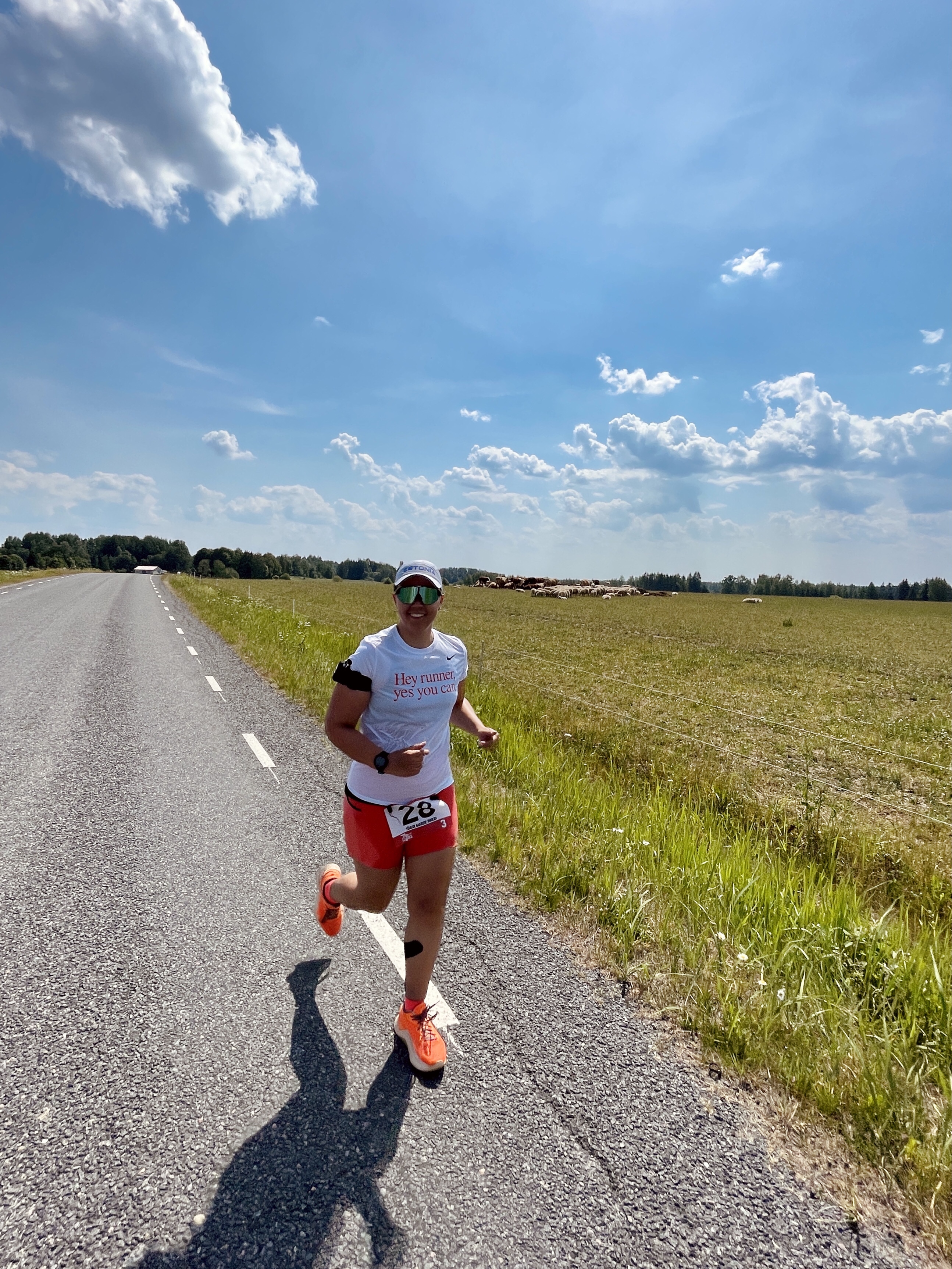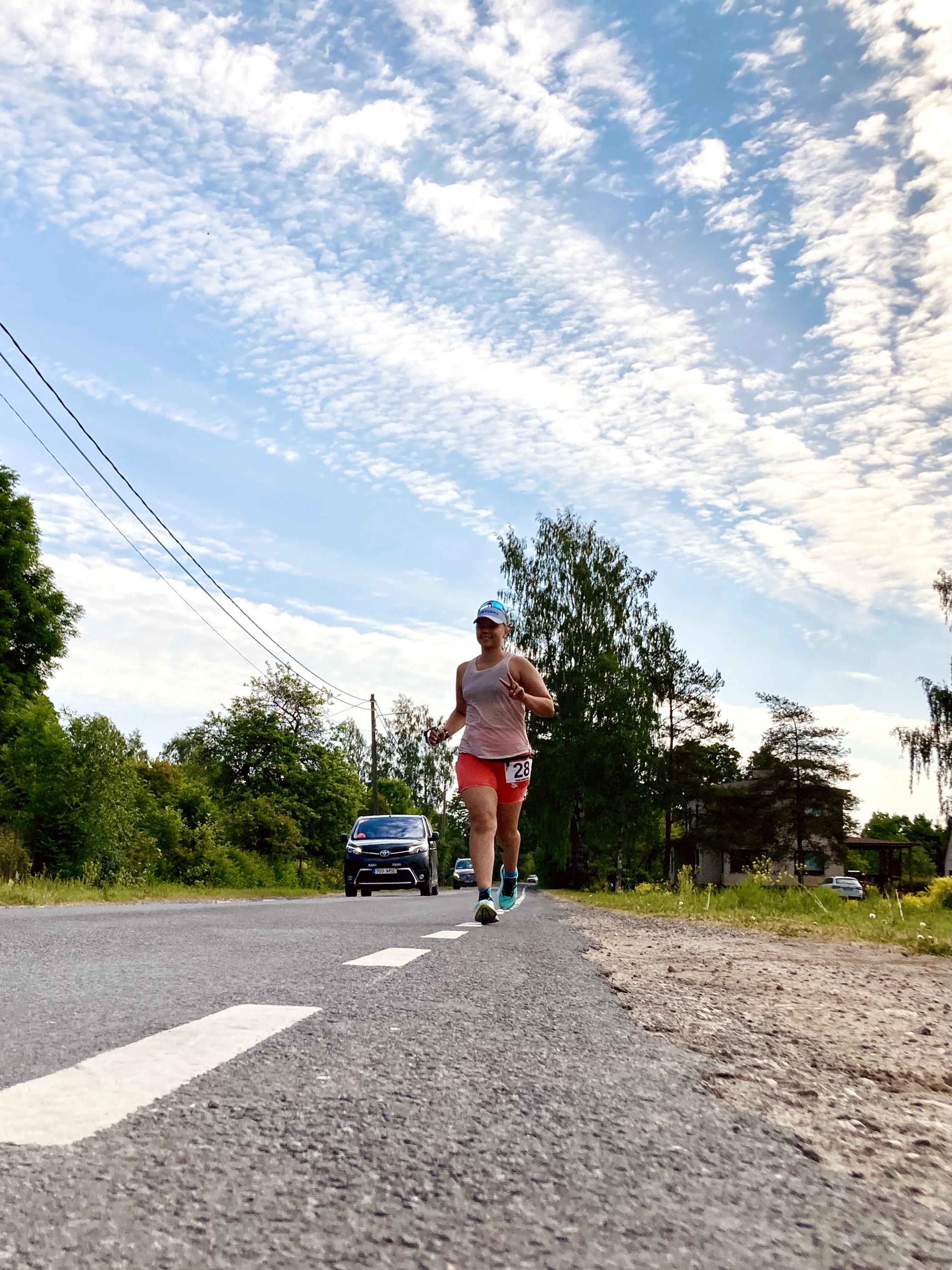 Teise vahetuse alguses, kui kell oli 7.30, oli juba lühikeste riietega liiga palav tee ääres seista ja jooksjat joota. Lootsime, et uus päev ja Põhja-Eesti toovad jahedama temperatuuri, aga ei midagi. Päike lõõskas taevas. Kui aga Tapale lähenema hakkasime, ilmusid taevasse vaikselt pilved. Läksin oma viimasele vahetusele vastu kell 8.26. Enne kastsin end korralikult veega märjaks. Päikesekreem, -prillid ja nokats on iseenesest mõistetavad.
