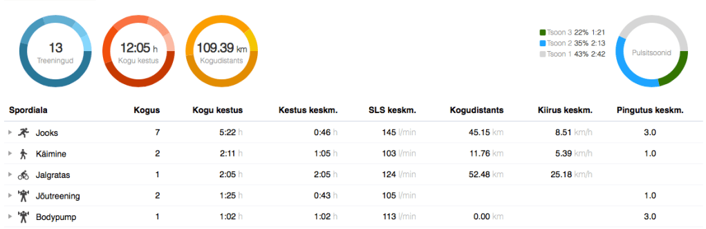 Teisipäev: BodyPump. Jõutrenn peab olema, muidu laguneb ära: proovitud, testitud, korduvalt ja korduvalt. Uus strateegia on selline, et selleks, et jalad suudaks nädala vältel ilusti joosta, tuleb jõutrenn jalgade osas lihtsalt kergem teha. See tähendab, et Pumpides hakkan jalalugusid lisaraskuseta tegema, ülakeha osas võib hagu anda. Tundub, et päris normaalselt toimiv süsteem: toonus on hoitud, aga lihasvalu pole. Sobib. (62 min, 114 l/min)