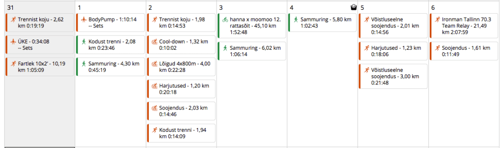 Esmaspäev: Jooks Jõud Venitus. Fartlek. Sel nädalal oli kavas 10 korda 2 minutit kiiret pluss 2 minutit mõõdukat jooksu. Välja tulid kiired nii: