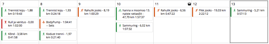Vaikselt hakkab nendest ühtede ja samade ringide tegemisest koppa ette viskama, aga põhimõtteliselt ongi veel ainult üks pikk treeningjooks Tartus järgmisel nädalal jäänud. Edasi on juba Kihnu poolmaratonile minek ja pärast seda tulevad koormused alla. Aeg kaob kiirelt.