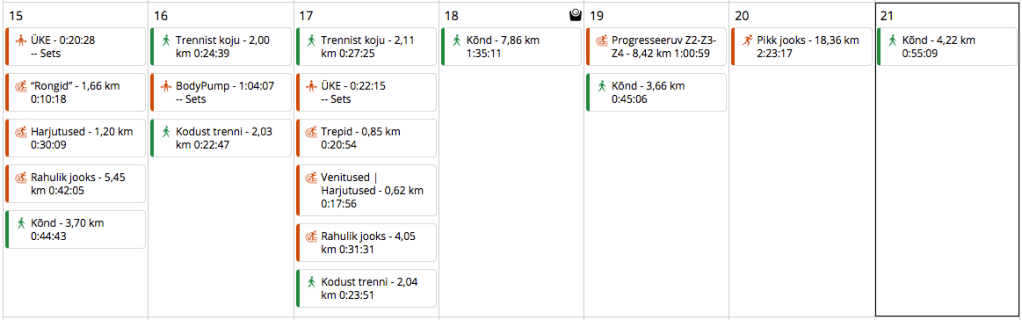 Esmaspäev: Jooks Jõud Venitus. Esmaspäev peaks olema lihtsam päev ja kui aus olla, siis vist oli ka. Alustuseks rahulik jooks, läksin varem ja tegin pikemalt kui ettenähtud 20 minutit. (5,45 km, 7:43 min/km, 141 l/min) Siis terve hunnik dünaamilisi venitusi ja jooksuharjutusi. Kiireteks liigutusteks olid sel nädalal “rongid”, mida eelmise aasta lõpus mõned korras tegime. Kes ei tea, siis 5–10-liikmelistes puntides joostakse suhteliselt rahulikus, püsivas tempos ja iga “rongi” viimase lüli ülesanne on “rongist” mööda spurtida. Kui ta on kohal, läheb järgmine. Niimoodi tegime 2 korda 4 ringi. Tempo kukkus vahepeal ikka kõikuma, aga pole hullu. (1,6 km, 6:12 min/km, 159 l/min) Kõige lõppu 20 minutit ÜKEt kerelihastele.