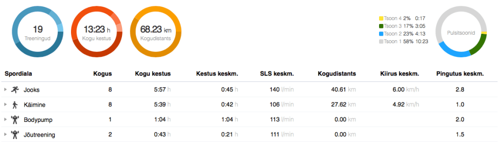 Teisipäev: BodyPump. Kristi vahetas mõned lood ära ja kasutas vanu häid klassikuid, sai veidike vaheldust juba harjumuspärasele kavale. (64 min, 113 l/min)