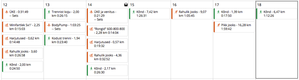 Kolmapäev: Jooks Jõud Venitus. Lõigutrenni päev, aga erilisi lõike ei tulnudki, sest treener otsustas meile lihtsama päeva teha ja oma plaanitud lõigud järgmise nädala peale lükata. Kuna mul oli nagunii kergem nädal plaanis, siis see minu plaane väga palju ei seganud. Korralik soojendus (4,36 km, 7:32 min/km, 141 l/min) ja jooksuharjutused alla, edasi nn rongid.
